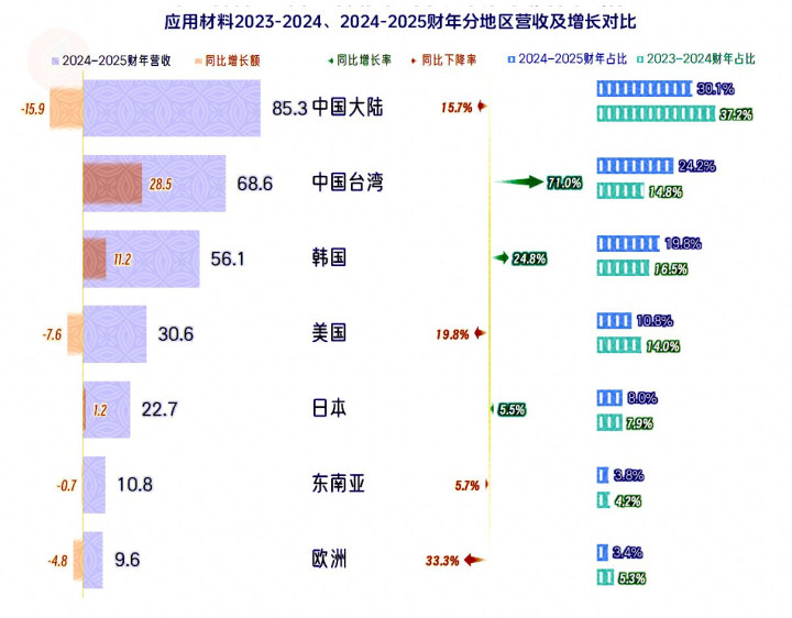 虽然出现了15.7%的下跌,中国大陆仍然是应用材料最大的市场,占比仍超过三成;中国台湾大幅增长七成多,反超韩国,夺回了第二大市场的位置;韩国市场也有1/4的增长,占比近两成,也是重要市场。美国和日本是一成左右的市场占比,东南亚和欧洲的市场占比相对较低,还出现了下跌。