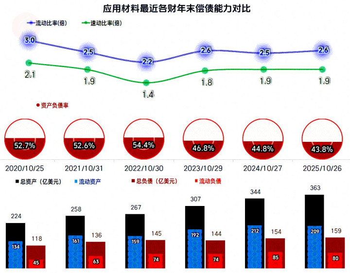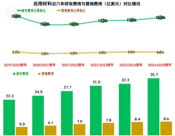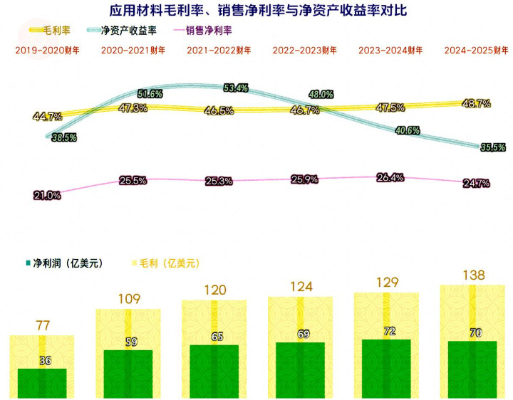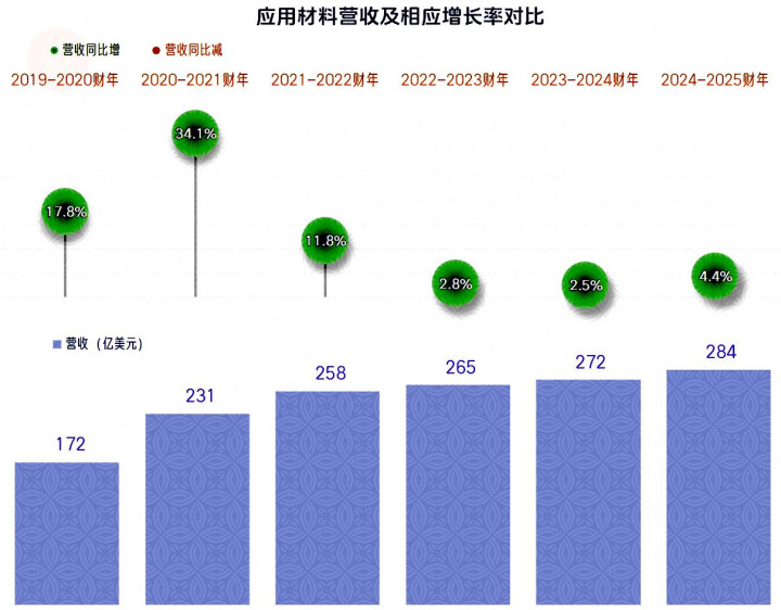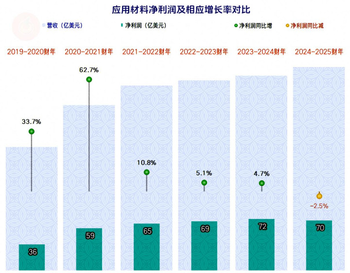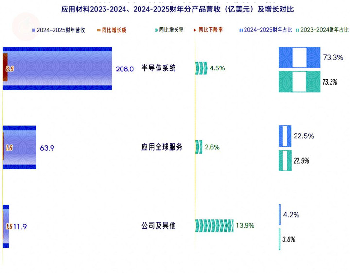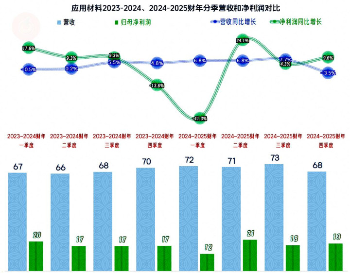 2024-2025财年(2024-10-28至2025-10-26)应用材料公司的营收同比微增4.4%,虽然延续了增长的趋势,但从2022-2023财年以来的,增长速度很低,差不多就是全球的平均GDP增速的水平。